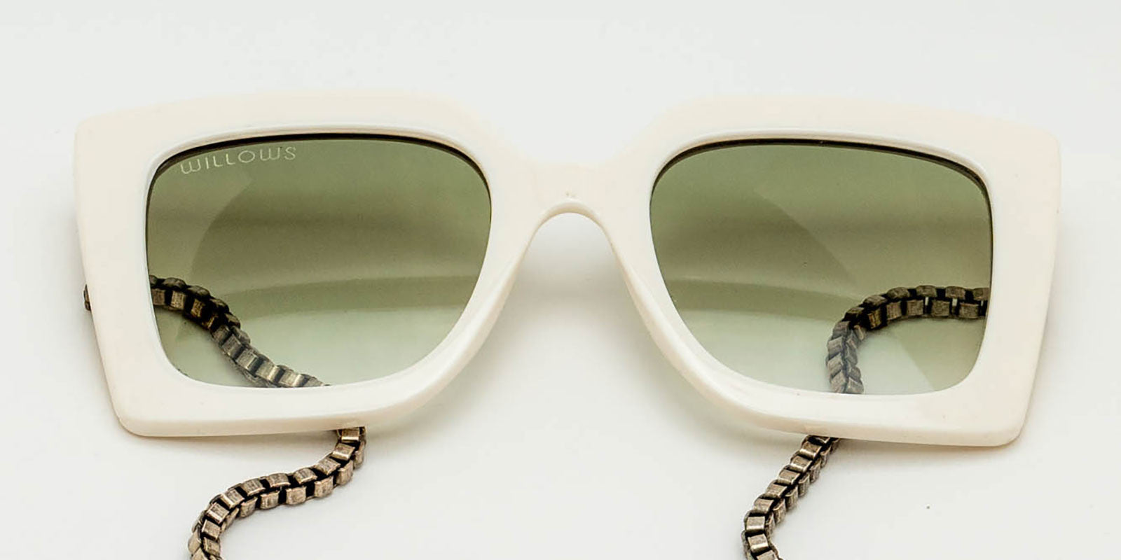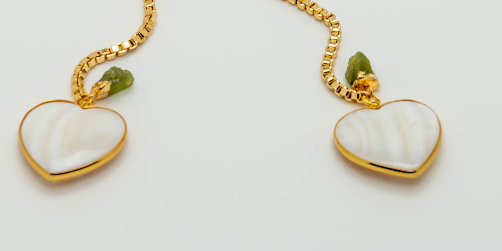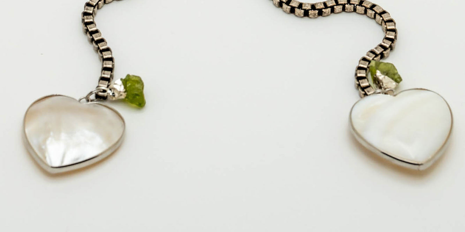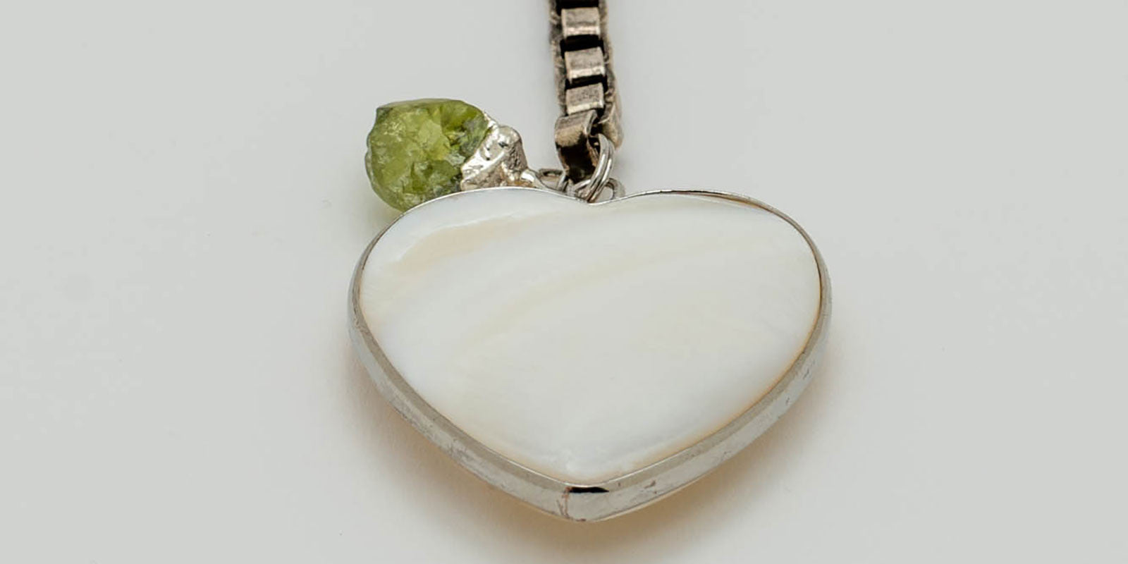 White square acetate frames. Antique silver plated box chain. Pearl Heart pendant with small peridot crystals.